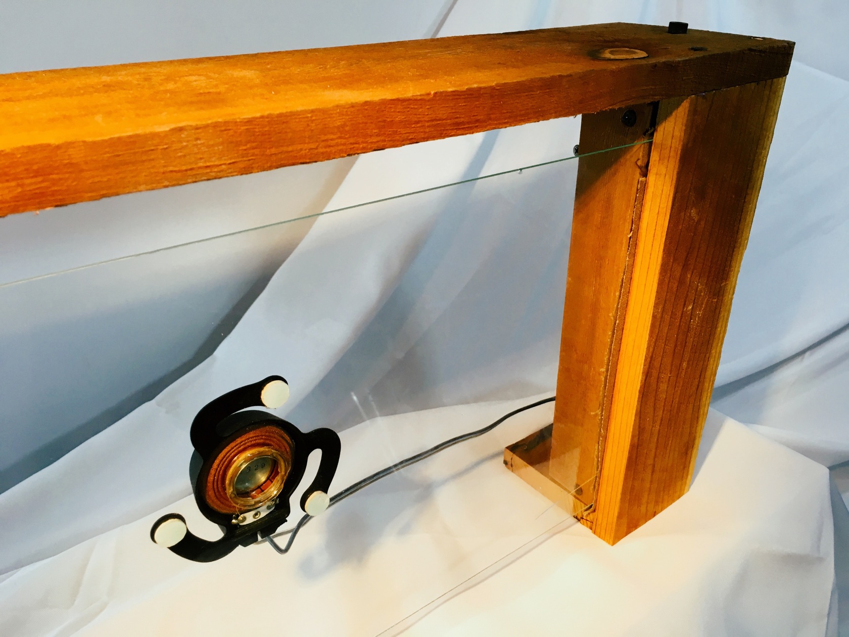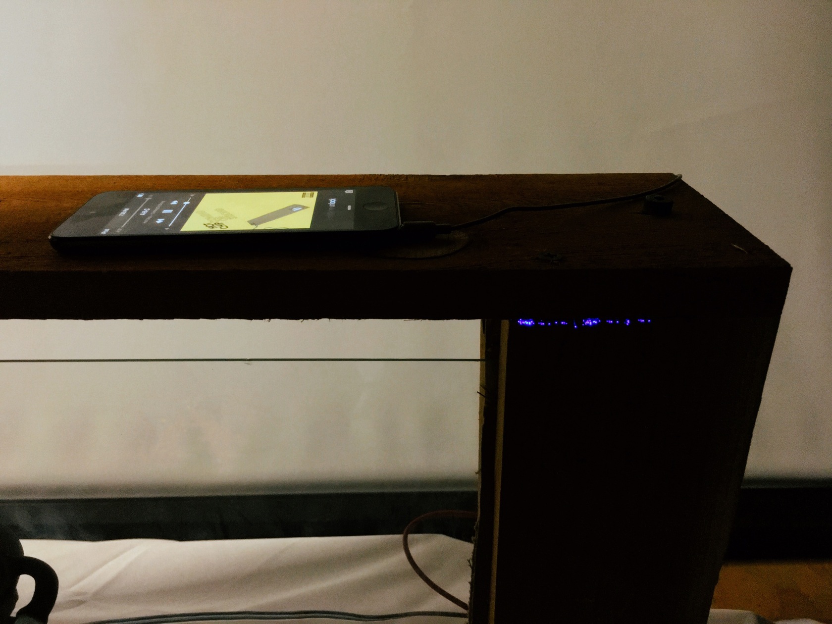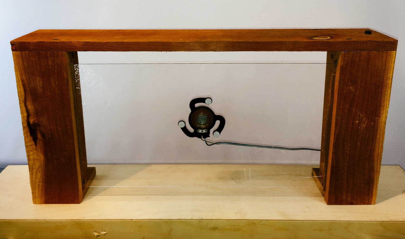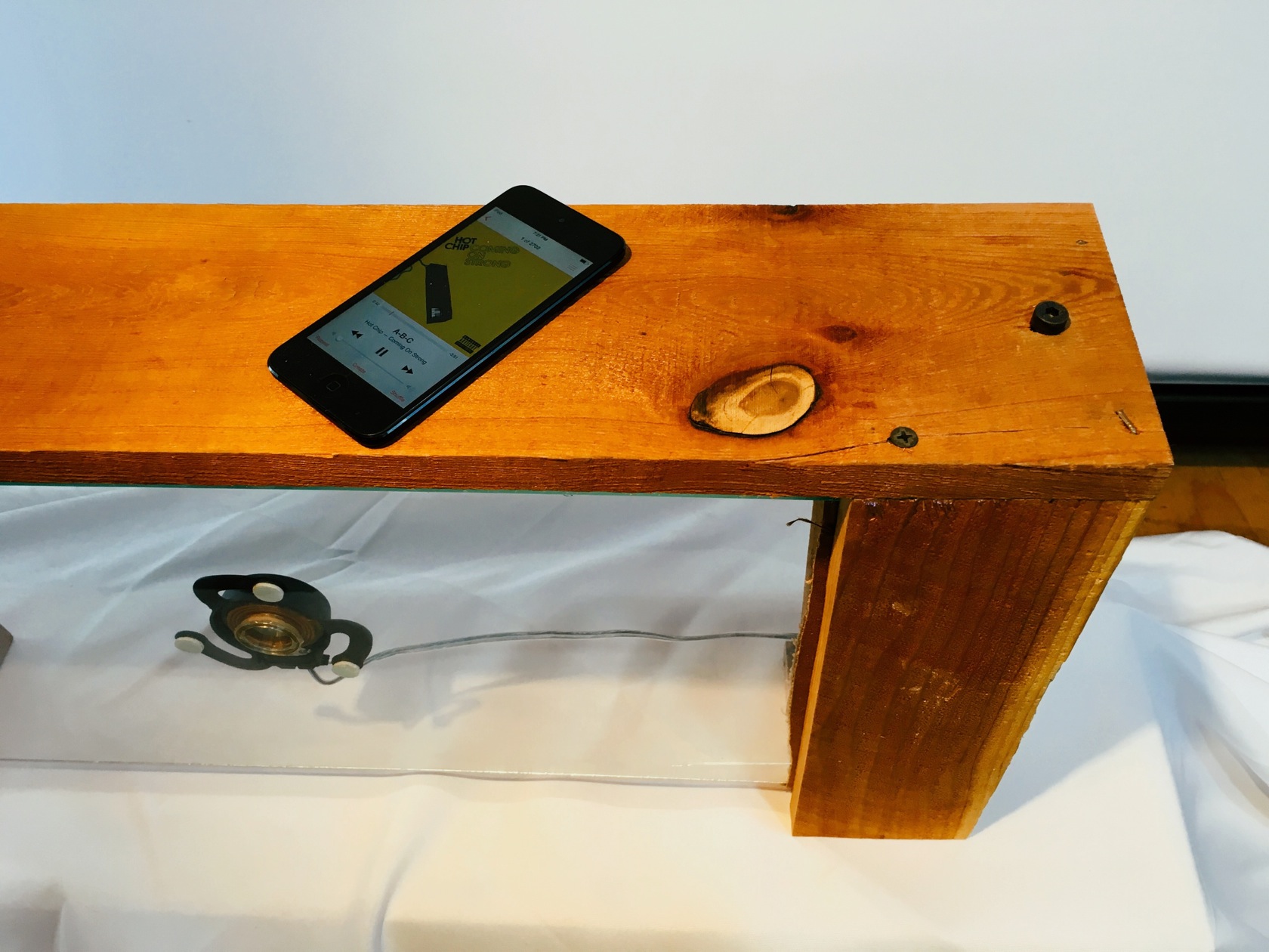 This speaker works by vibrating the glass to create sound waves. Fiberoptics poke through the joint between the redwood planks as the light indicator. It's a minimal piece that can be deceptive because of it's simplicity and unfamiliar diaphram design. Curious eyes find it as an item of interst before they realize its function.