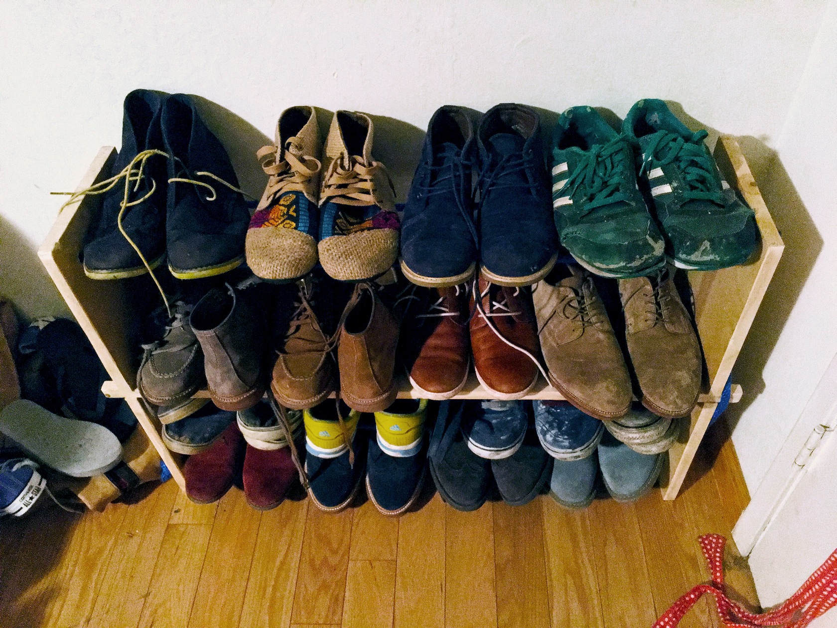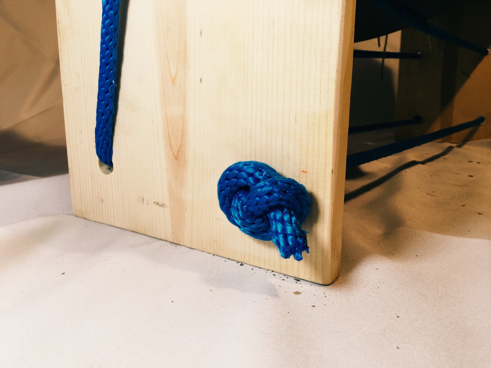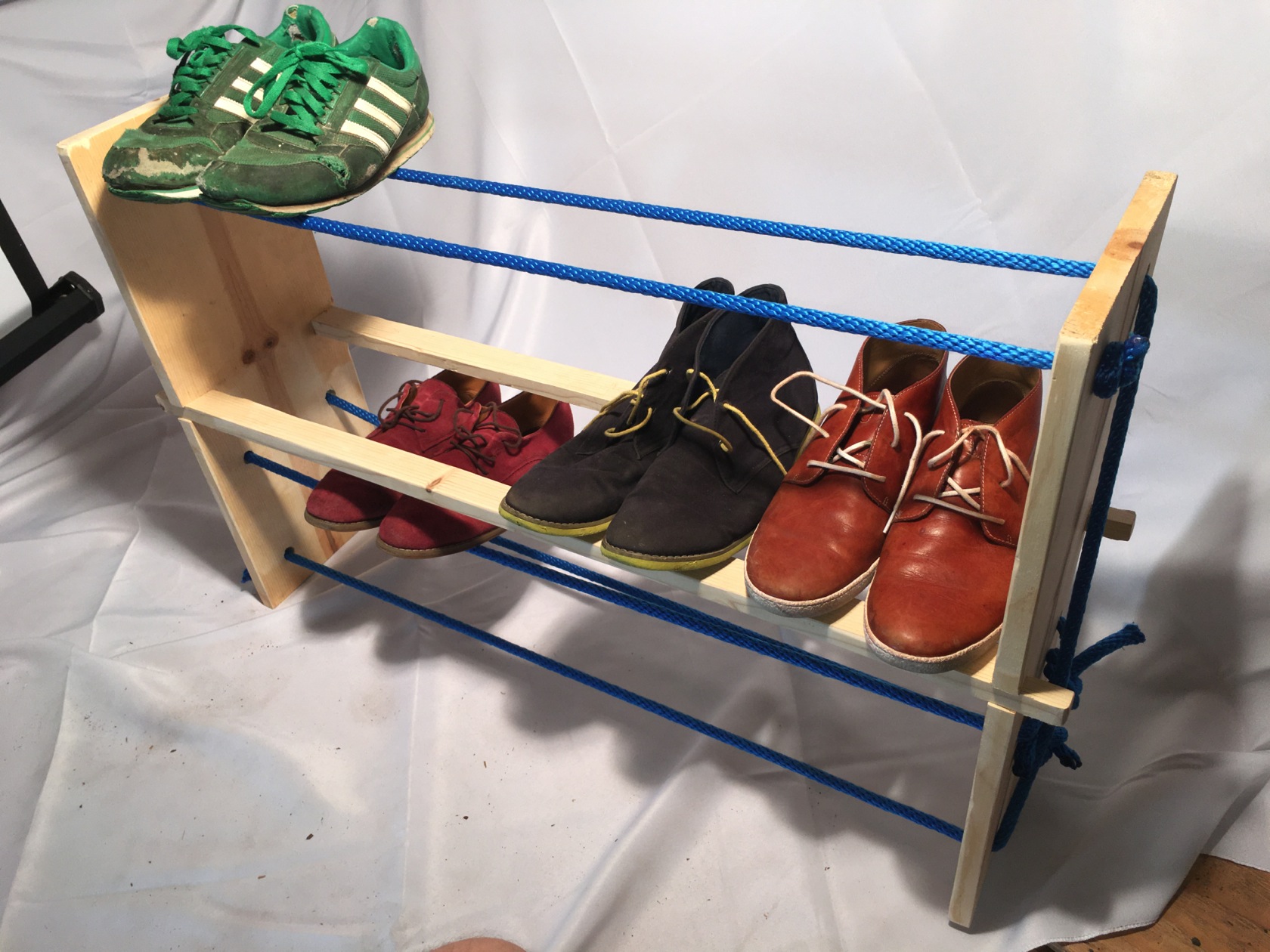 The pine sides and center are held in tension by the tautly drawn rope. One length goes back and forth to create two levels, another is pulled to form an intermediate level. The center shelf made of two pine planks is heavy duty enough to handle thick leather boots and meatier fashion statements. The blue rope levels afford a feeling of lightness, a sense of tossing your shoes onto them when finished. The ropes yield to the visual and material weight of the shoes.